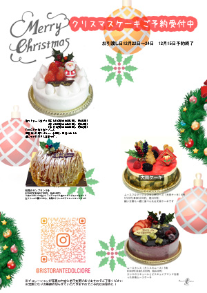 ![]() Xmas DINNER 12月22日〜12月24日 お一人様10500(税別)ご予約のみ ※画像は過去の参考例となります ![]() クリスマスケーキ2024 |